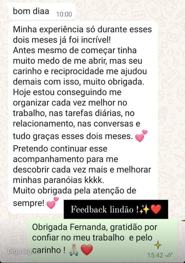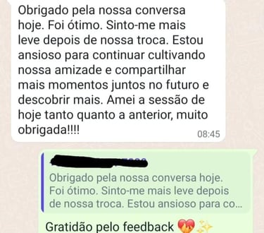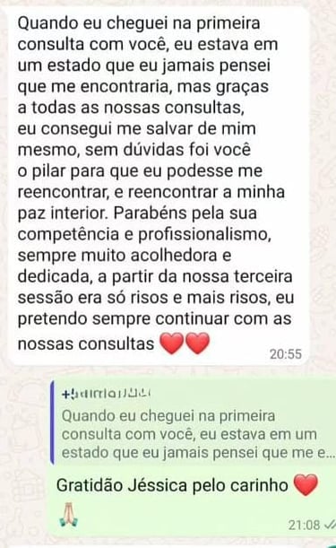 Realizo atendimento psicoterapêutico particular 100% online para o Brasil e exterior. Formada pela Universidade UNINASSAU desde 2021, tenho pós em terapia cognitiva comportamental ,especialização em relacionamentos e vários outros cursos de aprimoramento profissional.